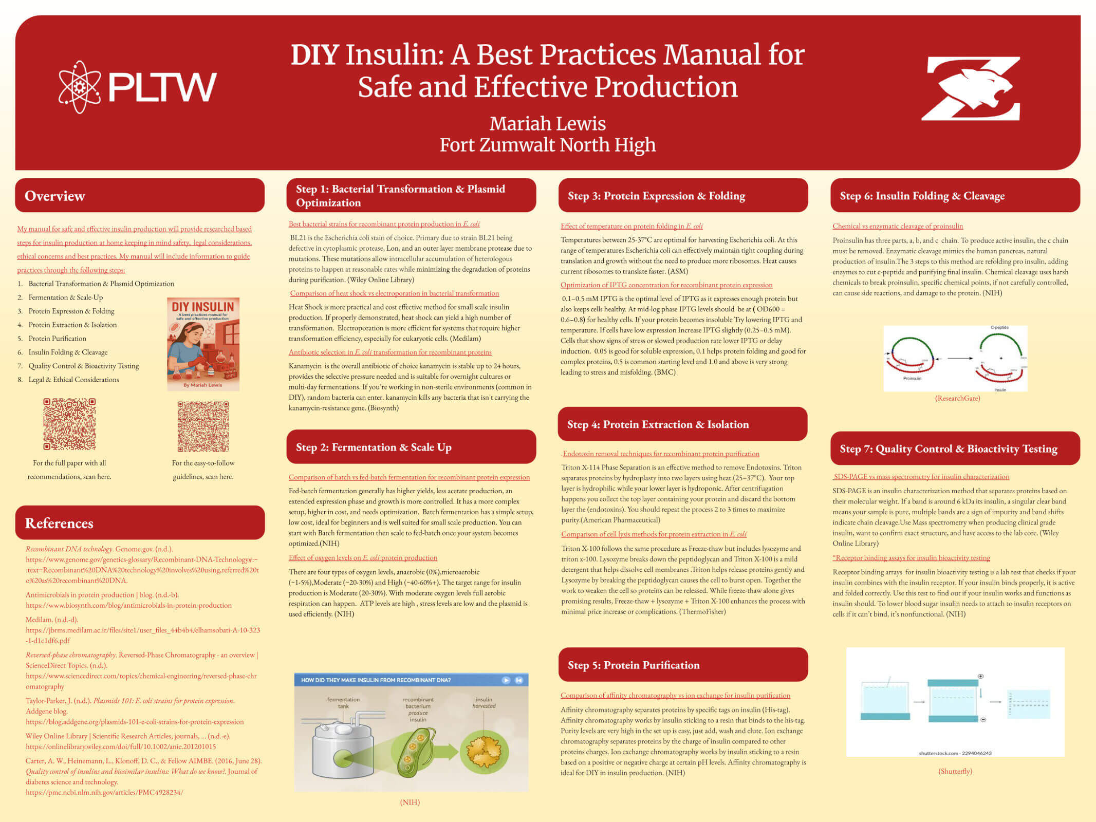 My manual for safe and effective insulin production will provide researched based steps for insulin production at home keeping in mind safety, legal considerations, ethical concerns and best practices. My manual will include information to guide practices through the following steps: