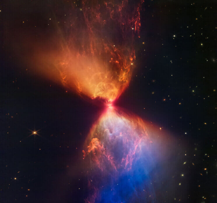 The protostar within the dark cloud L1527, shown in this image from JWST’s Near-Infrared Camera (NIRCam), is embedded within a cloud of material feeding its growth. Ejections from the star have cleared out cavities above and below it, whose boundaries glow orange and blue in this infrared view.