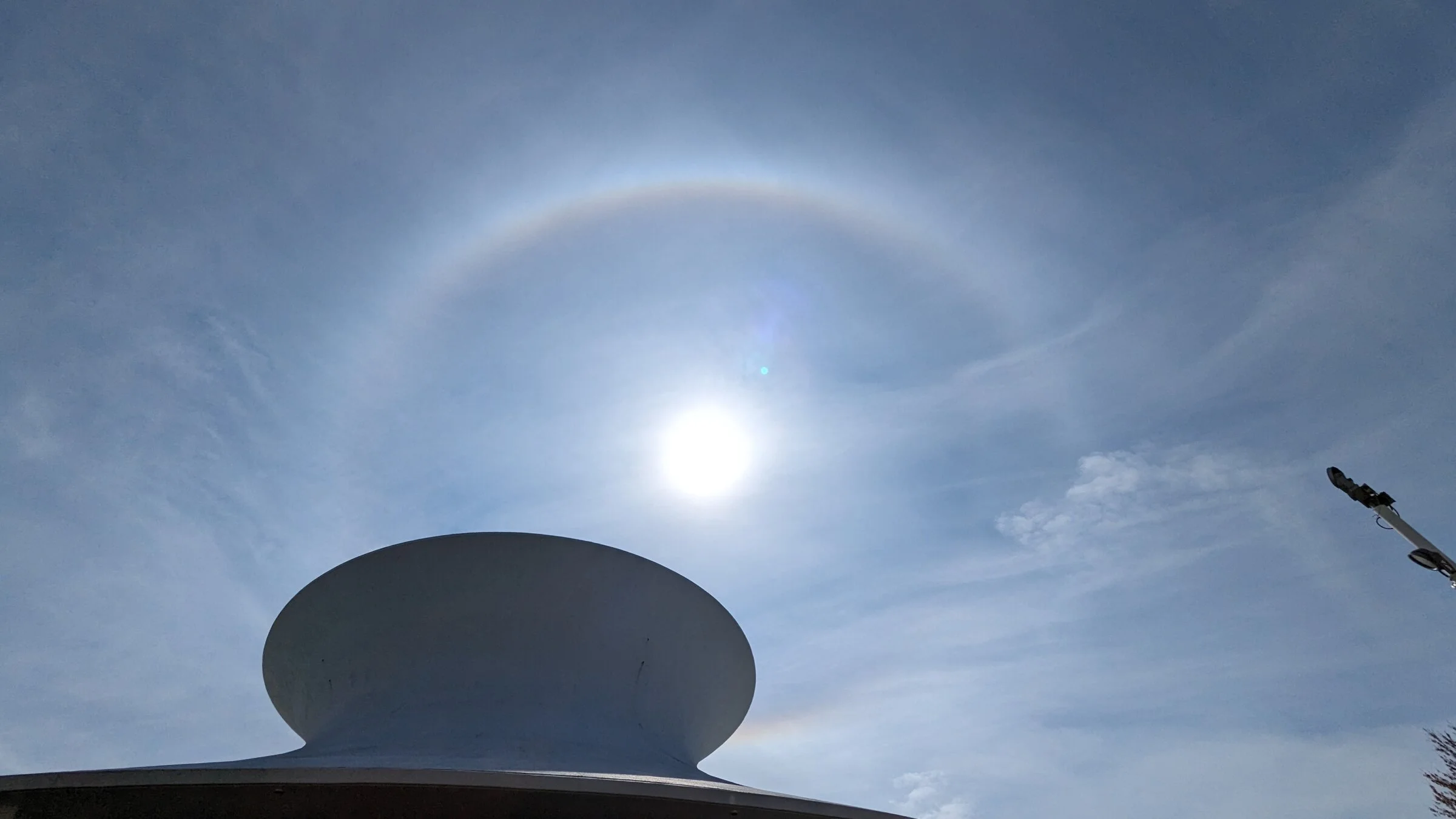 Have you ever noticed a large ring around the sun? This is called an ice halo. The most common type is known as a 22º halo. They are often seen around the Sun or the Moon when there are high altitude cirrus and cirrostratus clouds in the sky. To safely look at a halo, make Sure the Sun is fully shielded; you can use a building, a tree, a book, or whatever you have on hand. The halo is large and is almost always the same diameter. If you stretch out your fingers and hold your hand at arm’s length, the distance from the Sun to the halo will be about the same from your thumb to the tip of your pinky finger.