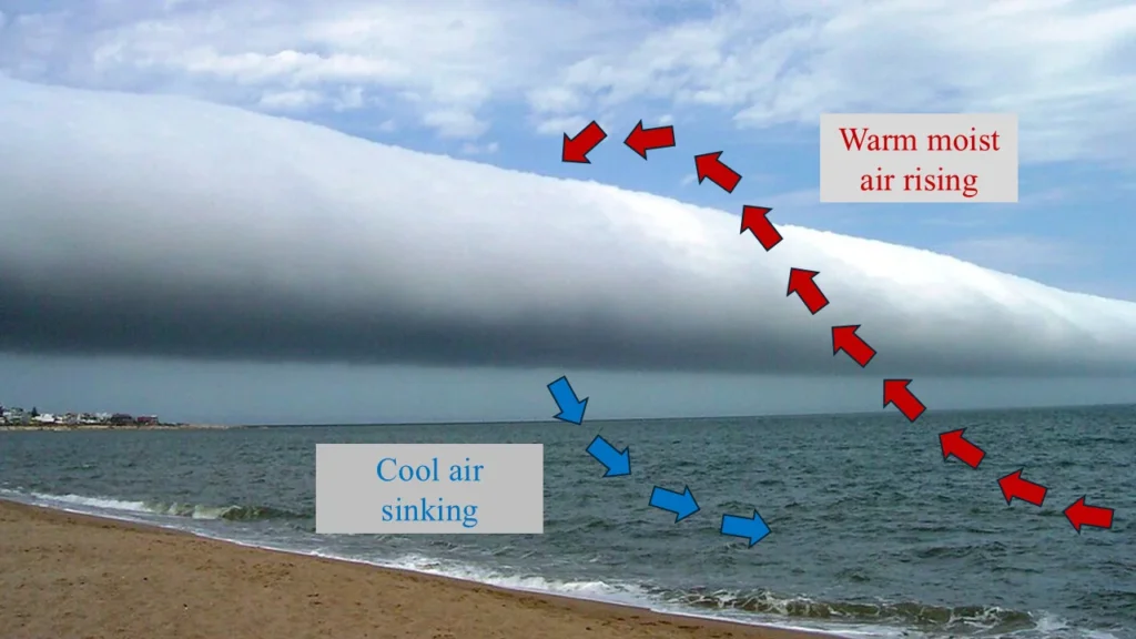 A roll cloud is a low level, tube-shaped cloud, that spins on a horizontal axis. They form along the leading edge of an approaching storm system (the gust front). A gust front is when cool, dense air gets pushed down and out from a thunderstorm’s downdraft. Think of this as cold air racing out ahead of the storm. The passage of a gust front can often resemble a cold front since winds become gusty and rapidly change in speed and direction. Temperatures will also drop sharply.