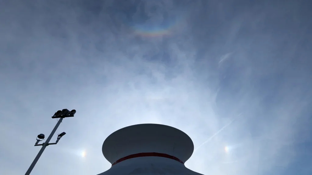 The halo is formed by the refraction of sunlight through millions of hexagonal ice crystals in the clouds. The crystals behave like jewels. The hexagon shape of these ice crystals, as well as their orientation, causes the sunlight to bend at a consistent angle, creating the circular ring. Halos can be seen all year round and they are more frequent than rainbows. If the Sun is low on the horizon, the halo may be accompanied by sun dogs on the left and right. Sun dogs are at their brightest when the Sun is low. There are a lot of infrequent halos and halo features to look out for too: tangent arcs, parry arcs, circumscribed halos, etc.