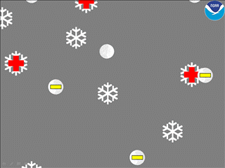GIF showing how ice crystals with a positive charge are less dense and will float up, while the negatively charged hail is more dense meaning it will fall downward within a cloud. Photo credit: NOAA