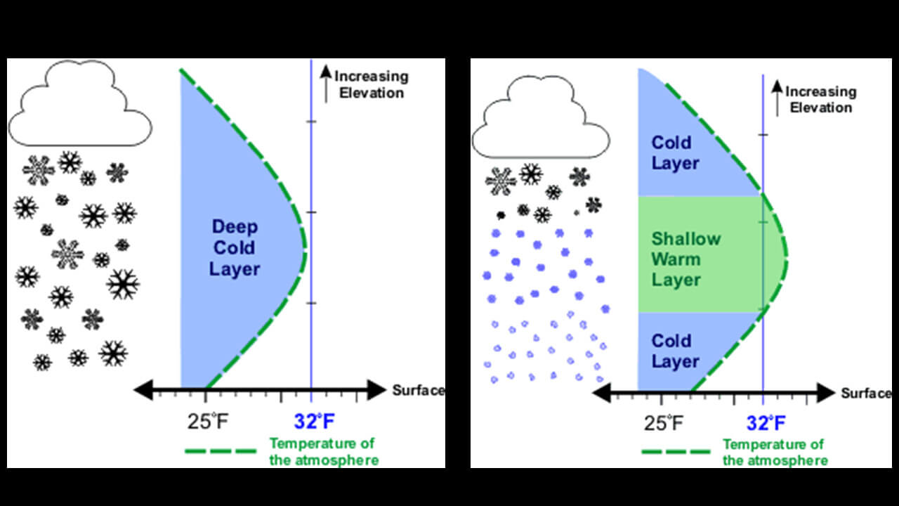 Images showing the vertical temperature profile associated with snow (left) and sleet (right). Photo credit: NWS