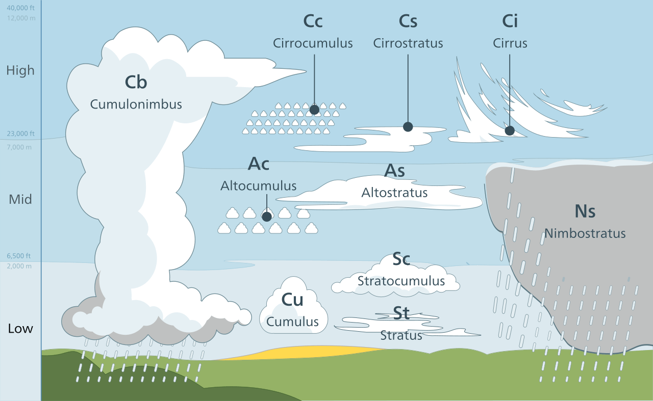 There are many different types of clouds which are separated into low, middle, and high-level clouds, determined by the cloud’s base above Earth’s surface. In 1803, an English naturalist named Luke Howard developed a cloud classification system in which he embedded Latin terms in the cloud names to describe their appearance. The first one being cumulus meaning “heap or puffy,” the second one stratus meaning “layered,” the third one cirrus meaning “wispy,” and lastly nimbus standing for “rain bearing.” One can use these names and even combine them to characterize the clouds we see.