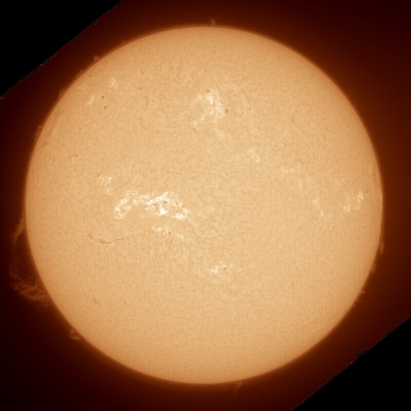 When looking through a white light filter, we see the Sun’s photosphere. This part of the Sun is the deepest we can see into our star, which is why the photosphere is often called the Sun’s visible surface. The features visible in the photosphere are sunspots, facula and granules. Sunspots and facula are caused by magnetic fields while granules are convective cells where hot plasma bubbles up and the cooler plasma sinks in the dark boundaries of the granules.