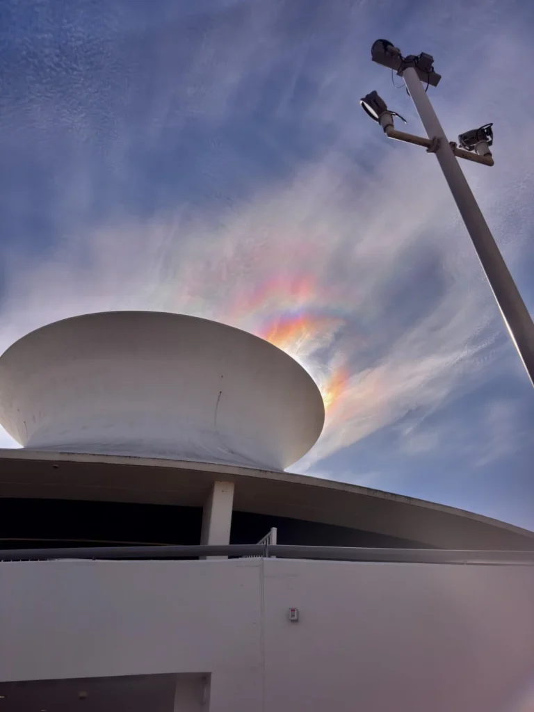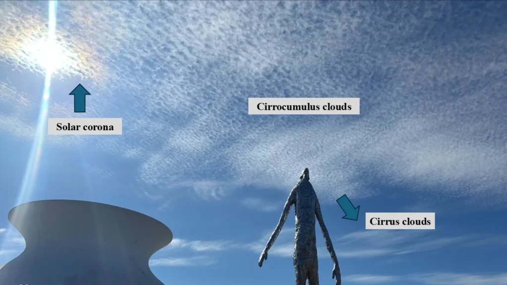 Image showing a solar corona caused by cirrocumulus in the top left, cirrus clouds that most likely formed from the cirrocumulus towards the bottom, and cirrocumulus clouds in the center at the James S McDonnell Planetarium February 12th, 2026. Image credit: Alex Guajardo