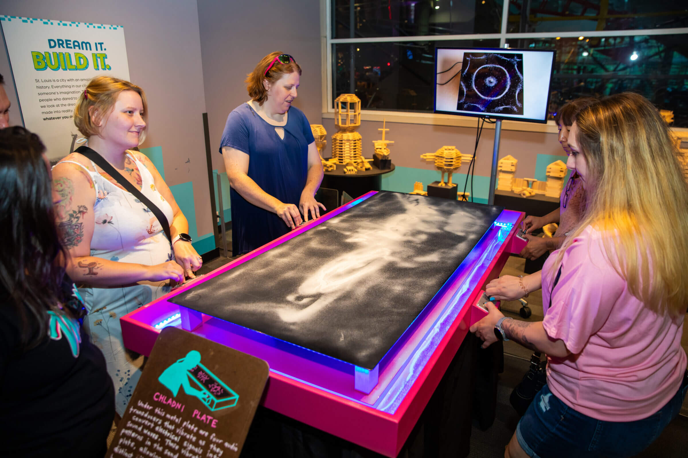 Guests use the Chladni plate, where sound forms patterns in sand.
