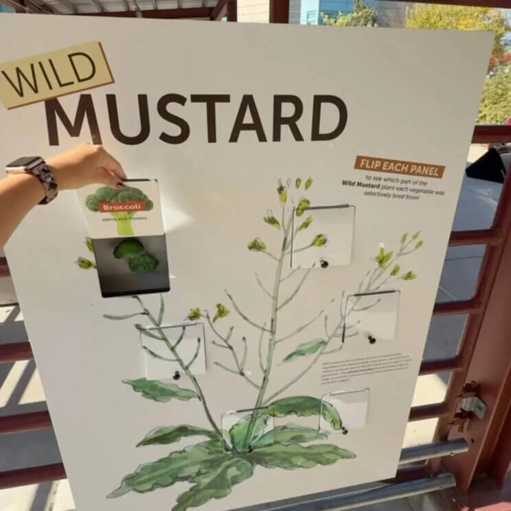 An interactive sign shows guests different plants and vegetables made possible with wild mustard through selective breeding techniques.