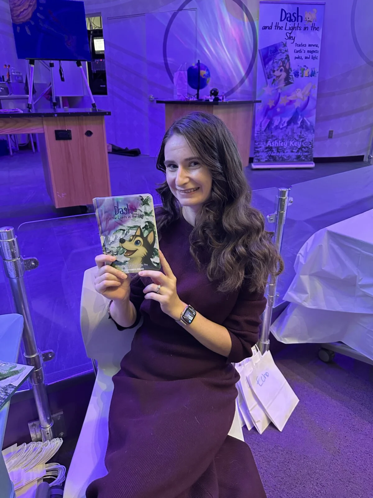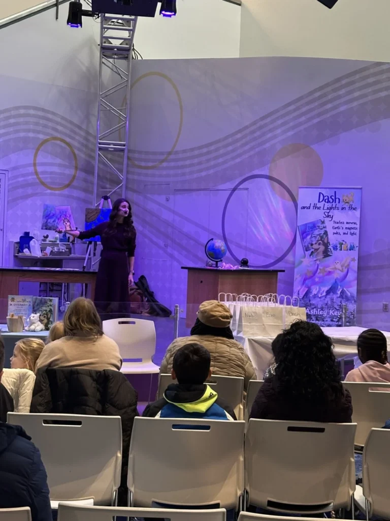 That sense of wonder was evident throughout Ashley’s reading and activities. Dash and the Lights in the Sky follows Dash, a curious husky who sets out to understand why the night sky is filled with colorful lights. Through lyrical storytelling and vibrant watercolor illustrations, the book introduces young readers to the science behind auroras in an accessible and engaging way.