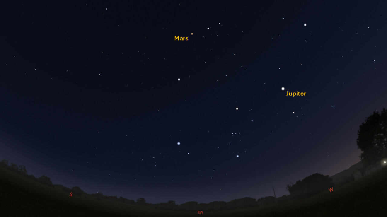 Jupiter will be visible high in the west not long after sunset. Jupiter sets by 23:59, remaining visible up to 23:00. Jupiter reaches superior conjunction on June 24, 2025.