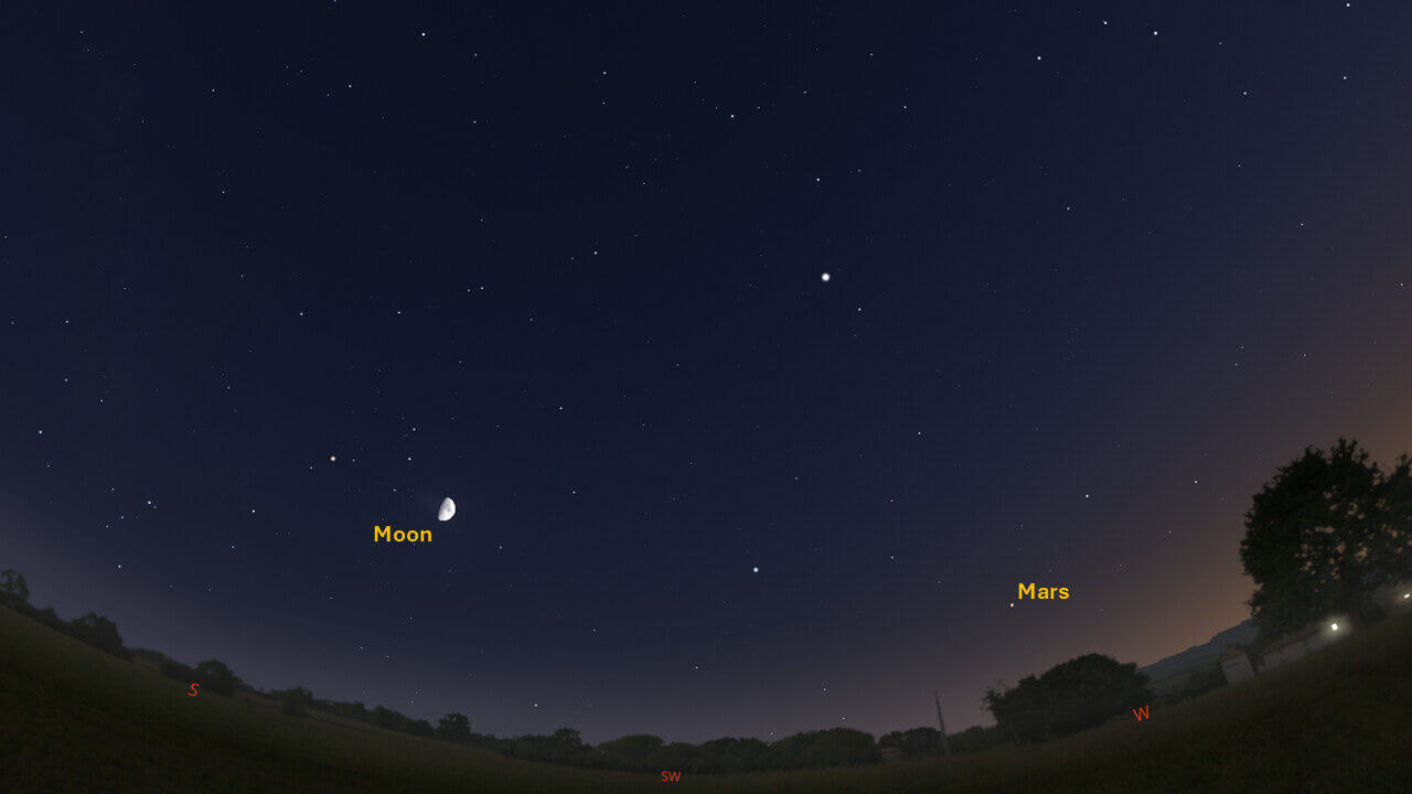 Look for Mars in the western sky after sunset. The current apparition of Mars will continue throughout the rest of 2025. As the year continues, Mars will slowly appear closer to the western horizon each night. Mars sets around 22:09.