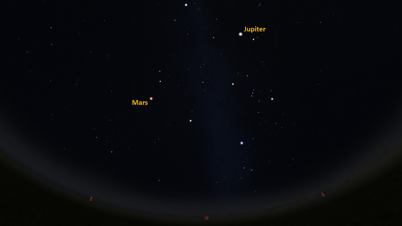 Now past opposition, Jupiter rises before the Sun sets. Look for Jupiter in the east as the sky begins to darken.