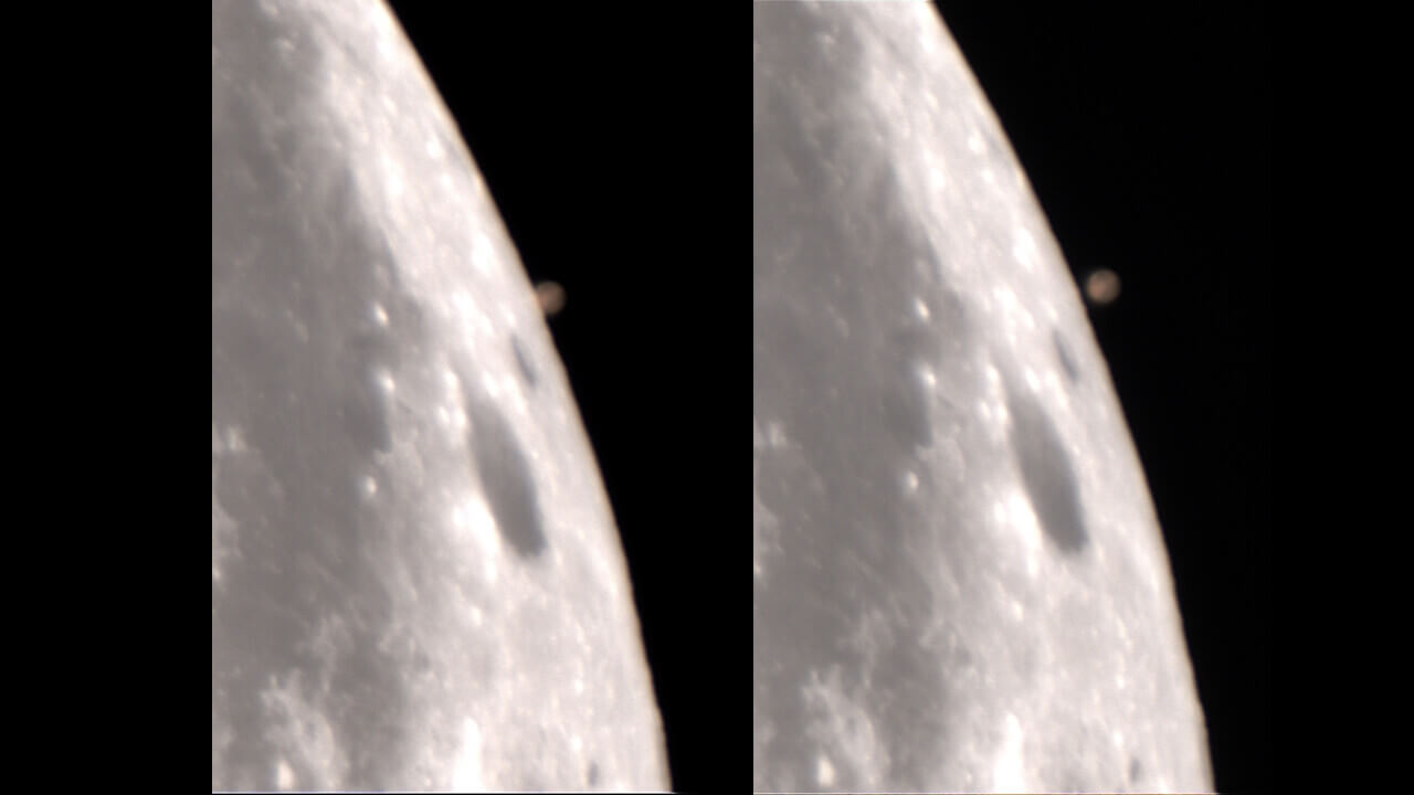 On January 13, 2025, an occultation of Mars was visible from the St. Louis region. The two images above show Mars reappearing from behind the Moon on that night. Images credit: Randy Harrison of River Bend Astronomy Club and Lookin’ Up Optics.