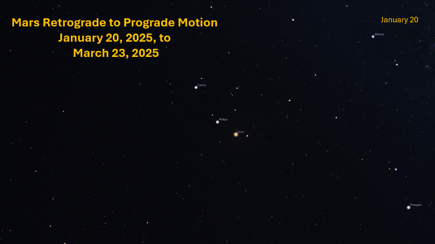 Over the next week, we will see Mars pass by the bright star Pollux first appearing east of Pollux on January 20. By January 26, Mars will be seen south of the bright star. During this time, Mars and Pollux will appear separated by a little more than 2°. If you keep watching Mars past this week, it will eventually move west of Pollux due to retrograde motion. Mars will continue to shift westward until retrogression ends on February 24, 2025. After this date, Mars will resume its normal prograde motion shifting back towards the bright star Pollux. Mars will appear east of Pollux again by March 23, 2025.