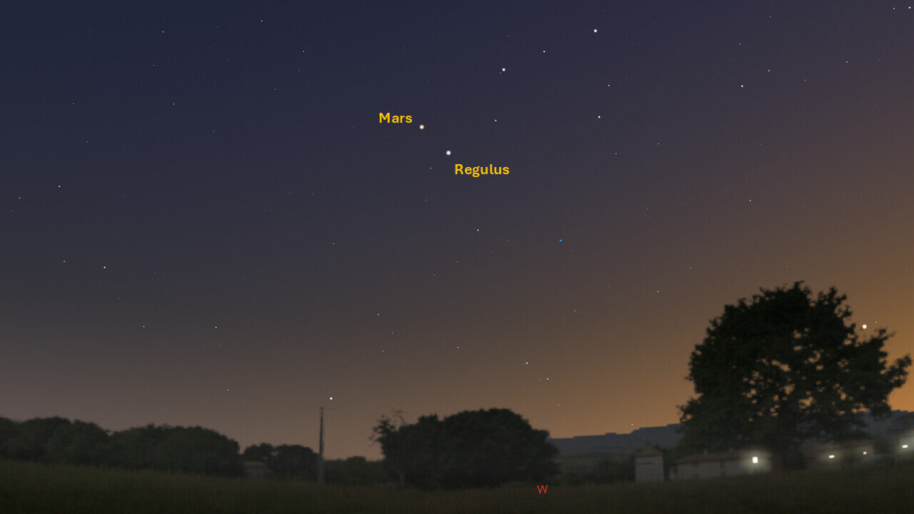 Look for Mars in the western sky after sunset. The current apparition of Mars will continue throughout the rest of 2025. Watch for the Red Planet as it shifts westward through the year. Mars sets around 23:53.