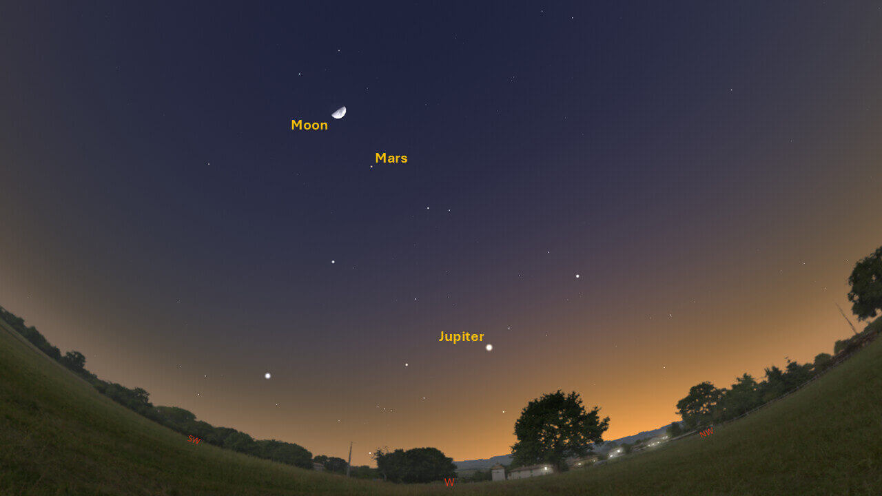 Jupiter will be visible in the west not long after sunset. Jupiter sets by 22:52, remaining visible up to 22:00. Jupiter reaches superior conjunction on June 24, 2025.