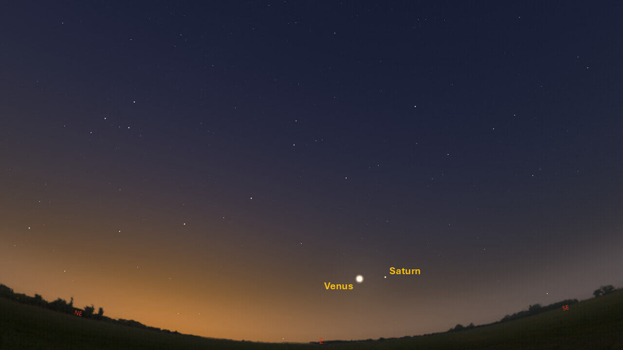Saturn has returned to morning visibility rising just before the Sun. Look for the planet in the east about 45 minutes before sunrise. Saturn now appears about 4.5° south of Venus