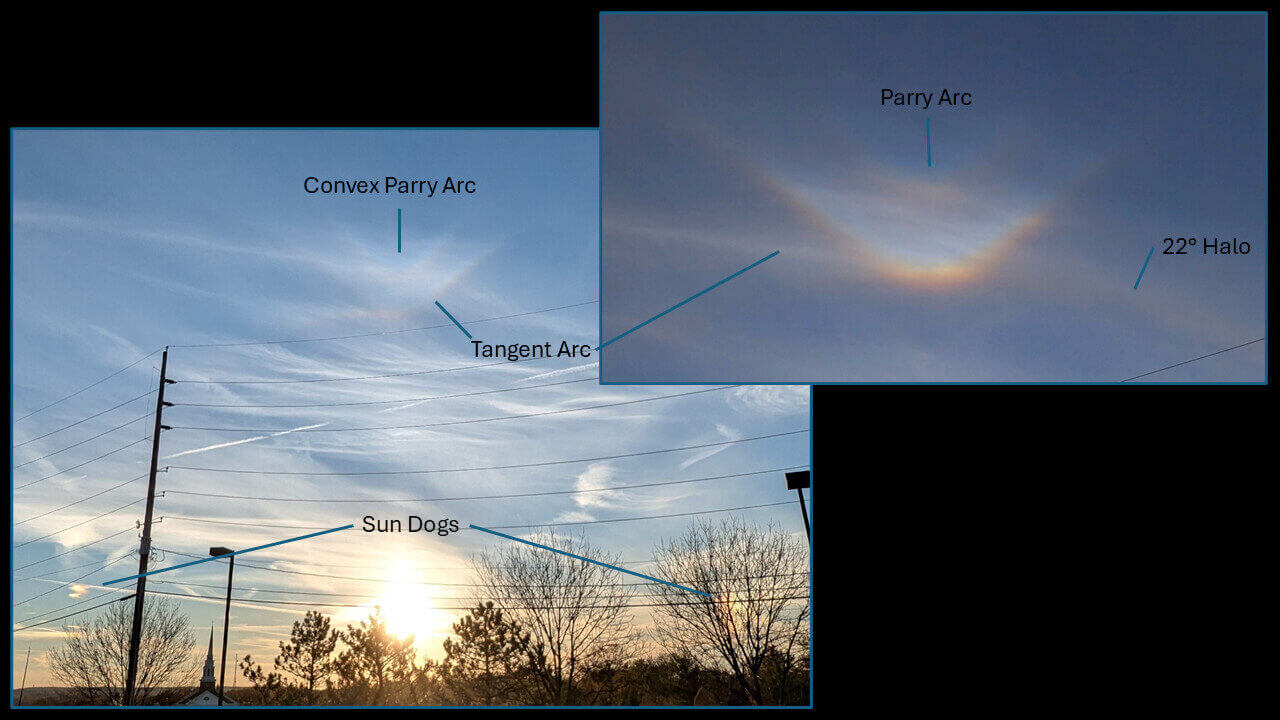 Once you learn the conditions apt to produce these optical displays you will notice them frequently. If you remain diligent in observing you will find a few days when rare displays are visible. About a year ago I was lucky enough to observe several types of ice halos one afternoon which included a 22° halo, upper tangent arc, sundogs and a circumzenithal arc. Eventually that same afternoon, I was lucky to see a rare convex parry arc. These ice halos are rare because they require a specific shaped ice crystal which also must be oriented in a precise way. Atmospheric optics expert Les Cowley states on his website that based on 10 years of observation by the German Halo Research Group, you can expect to see on average 100 22° halos in one year and only one parry arc. Needless to say, in many years of looking for atmospheric optics, this was the first time I had seen a parry arc.