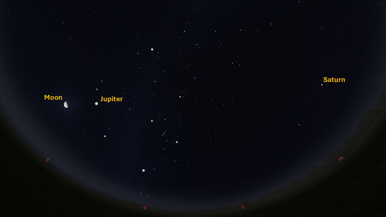This week, Jupiter rises around 21:13. Look for Jupiter in the east around 23:00. Jupiter reaches opposition on January 10, 2026. As we continue towards this date, Jupiter will continue to rise earlier each week.
