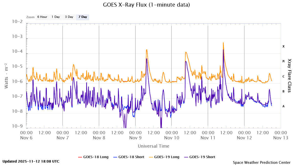 This graph shows the x-ray flux that occurs during a solar flare. The x-rays produced by solar flares arrive at Earth about 8.3 minutes after leaving the Sun. Detectors aboard NOAA’s GOES satellites record the x-ray flux as they encounter this increase in x-rays. The three large peaks on the graph are the solar flares from November 9, 10 and 11, 2025. Image credit: Space Weather Prediction Center