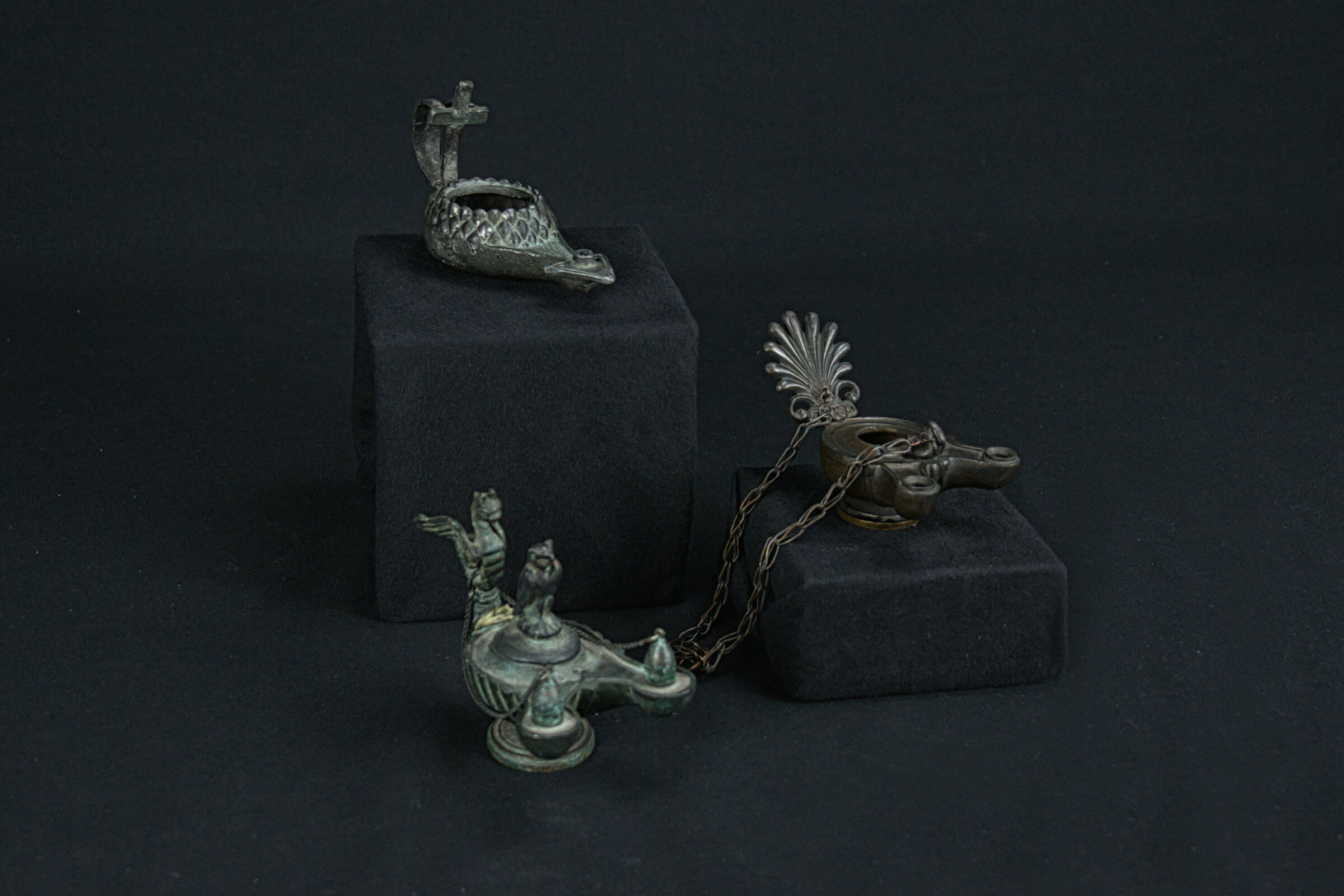 Romans were skilled metalsmiths, crafting a diverse array of objects including jewelry, coins, tools, weaponry, furniture, sculpture, lamps, and other household items. They favored bronze over all other metals for their finest work, as evident by these detailed lamps. Bronze oil lamps were luxury items made for the wealthy and are among some of the rarest artifacts to come from the Roman Empire.