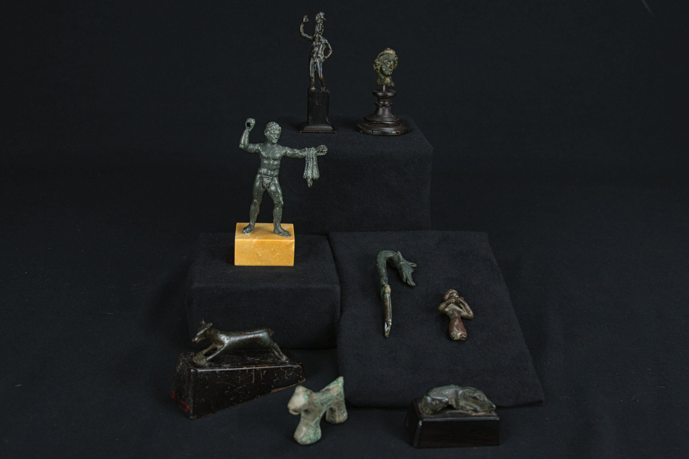 The Romans had a long history of making statuary in bronze, and thousands of images of gods and heroes, victorious athletes, statesmen, philosophers, and sacred animals filled ancient temples and homes. The material lent prestige and beauty to objects like these statuettes, most of which would have been dedicated to the gods.
