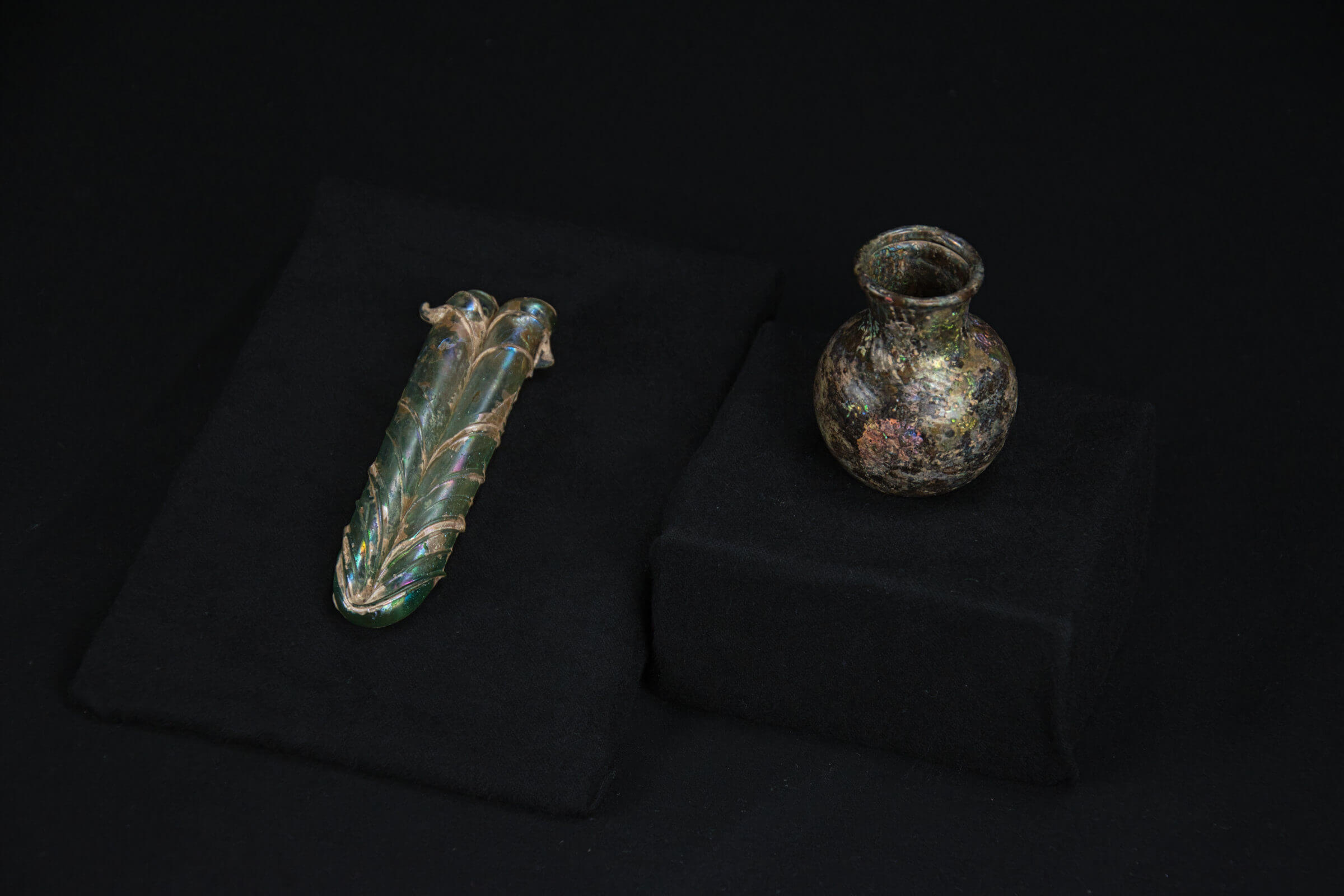 Roman glassware includes some of the finest pieces of art ever produced in antiquity. Glass unguentaria like these here held the various oils, perfumes, and cosmetics used by nearly every member of Roman society. These objects demonstrate the revolutionary invention of glassblowing, which allowed vessels to be made in a wider range of shapes because they had thinner walls that were easily molded.