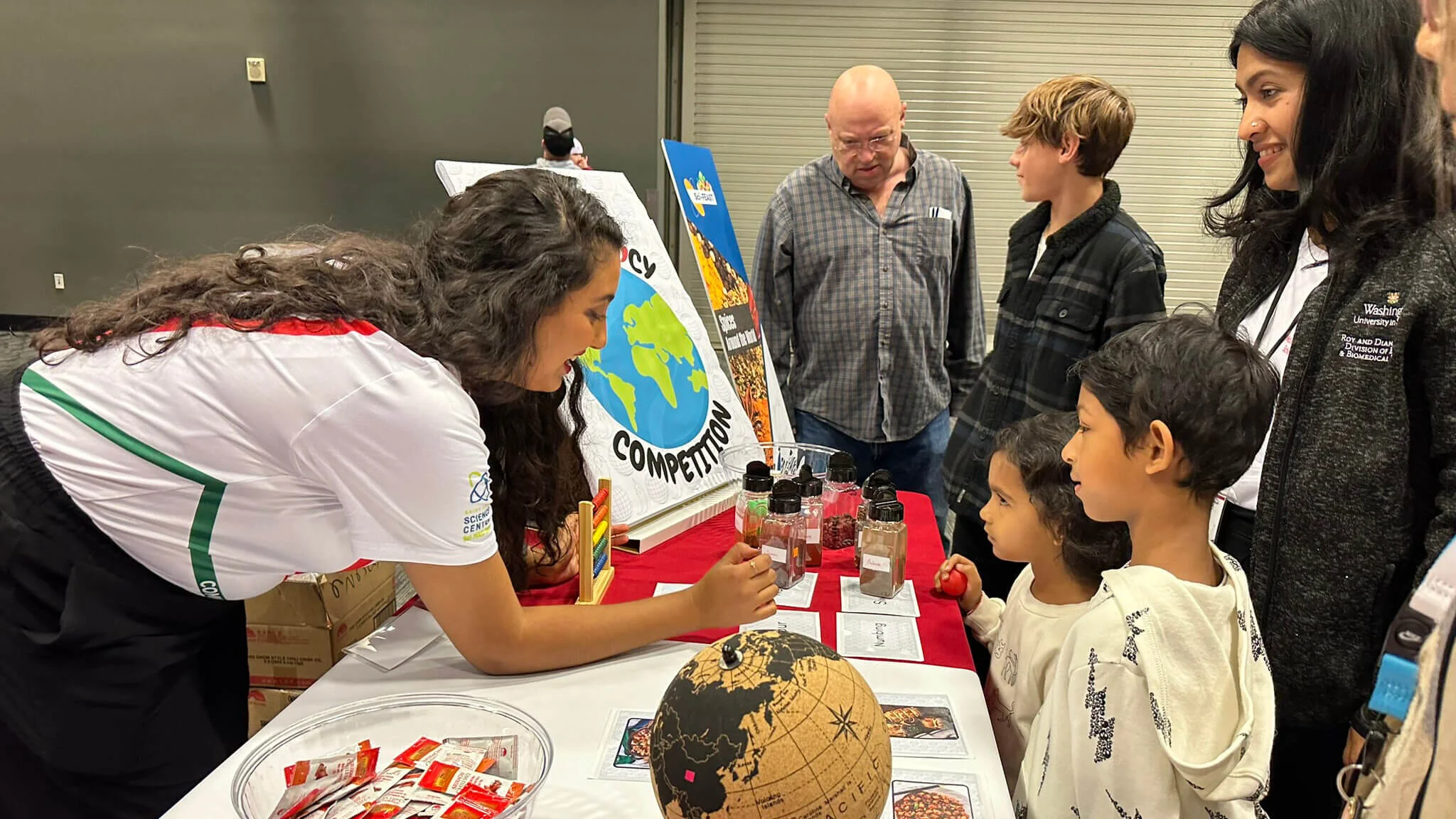 In Boeing Hall, Washington University’s McDonnell International Scholars Academy presented a Global Food Science Experience, exploring foods from around the world with examples of Asian pears, longans, pomelos, and plantains. In addition, guests could explore various spices from different countries and even try an herb matching activity. Meanwhile, on the Lower Level, WashU Earth, Environmental, and Planetary Sciences presented a close-up look at dinosaur “gastroliths”—rocks the prehistoric animals used for digestion.