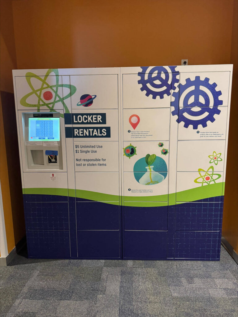 Lockers are available on the Oakland building’s Lower Level on a first-come/first-served basis. Guests can rent a locker for single or multiple use during their Science Center visit.*
